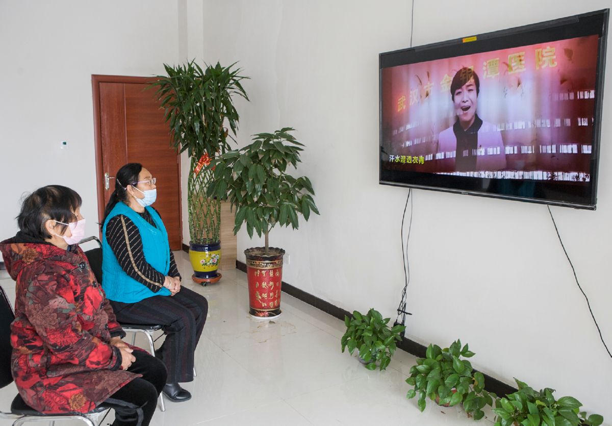 2月28日,两位妇女在观看万荣县文化馆线上展播的优秀抗疫独唱作品《为了谁》。 特约摄影 李克荣