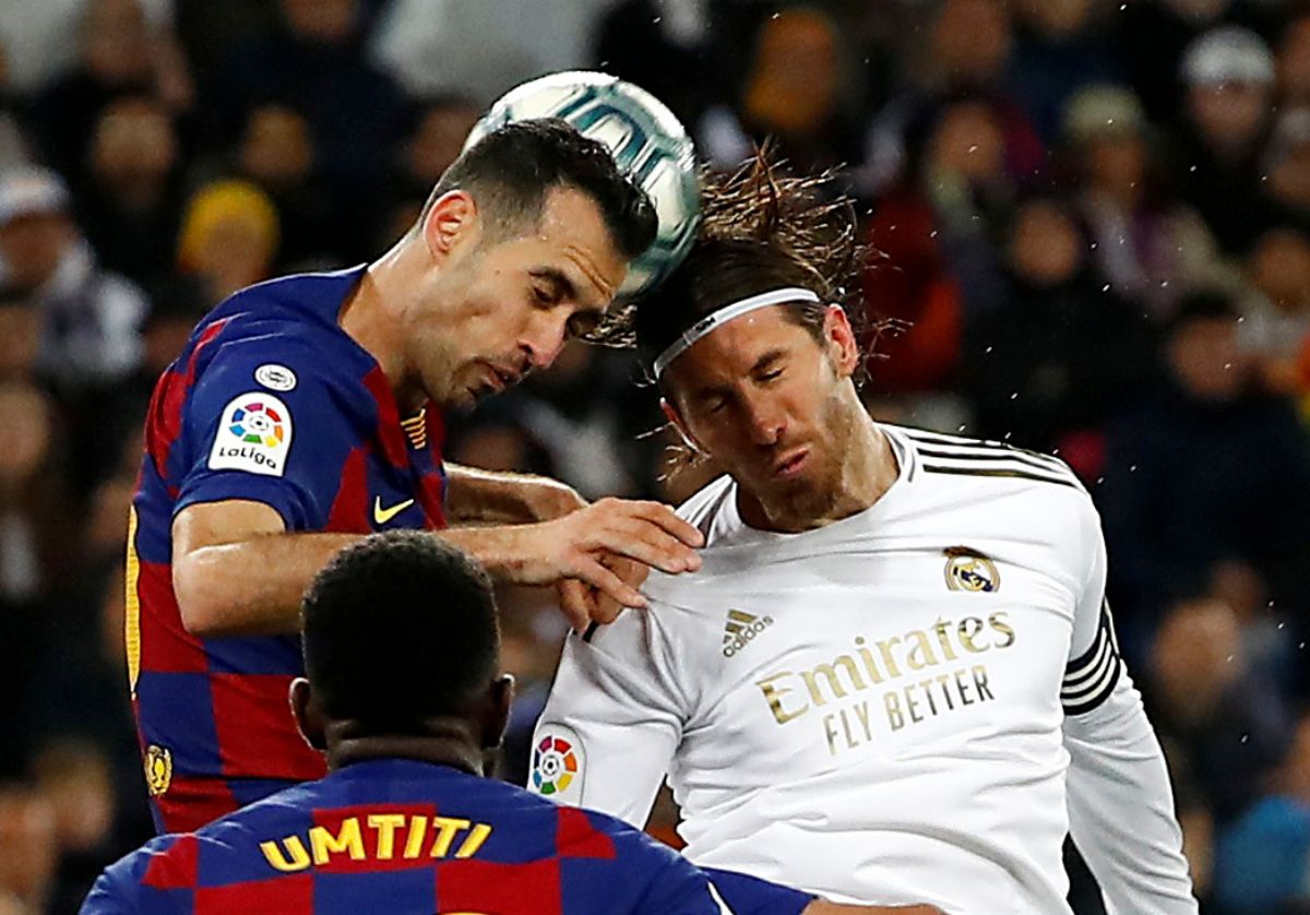 3月1日,皇家马德里队球员拉莫斯(右)和巴塞罗那队球员布斯克茨争顶。