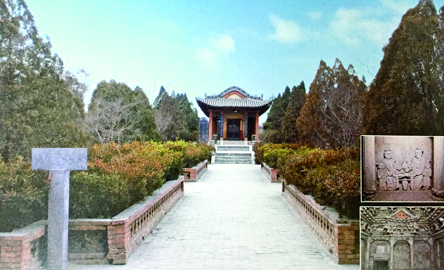 【马村砖雕墓】 类型:古墓葬 时代:宋、金 地址:稷山县城西2.5公里下迪乡马村 此处共发现墓葬14座,已发掘9座。据《段楫预修墓记》和对墓葬形制的判断,为金大定以前的段氏墓地。墓皆南北方向,结构形制近同,仅有大小和繁简之别。墓道有斜坡、阶梯、竖穴三种形式,较狭窄。墓门外仿木构门楼装饰华丽,或设重台勾栏,或雕武士、镇兽。门洞内砌筑板门。墓室平面多为长方形,部分为方形,墓顶均为方形覆斗顶。墓室建筑主要表现墓主生前的豪华宅地——四合院,四壁下部砌束腰须弥座,雕飞马、奔鹿等兽,刻工精细。也有少数中间雕墓主“开芳宴”,而次间置屏风雕孝子图。