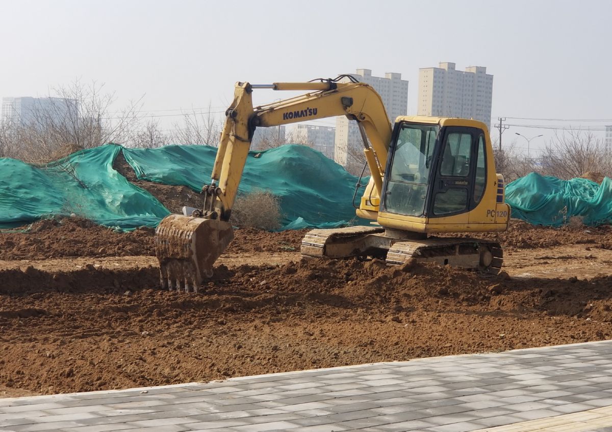 ▲挖掘机在进行道路南侧游园路基础建设 范楚乔 摄