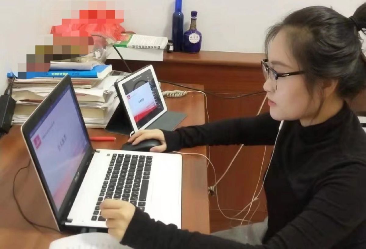 盐湖区红军小学老师刘柯荣正在上直播课。连日来,该校开展的在线教学课保障学生及时开启新学期学习。 记者 李宏伟 摄
