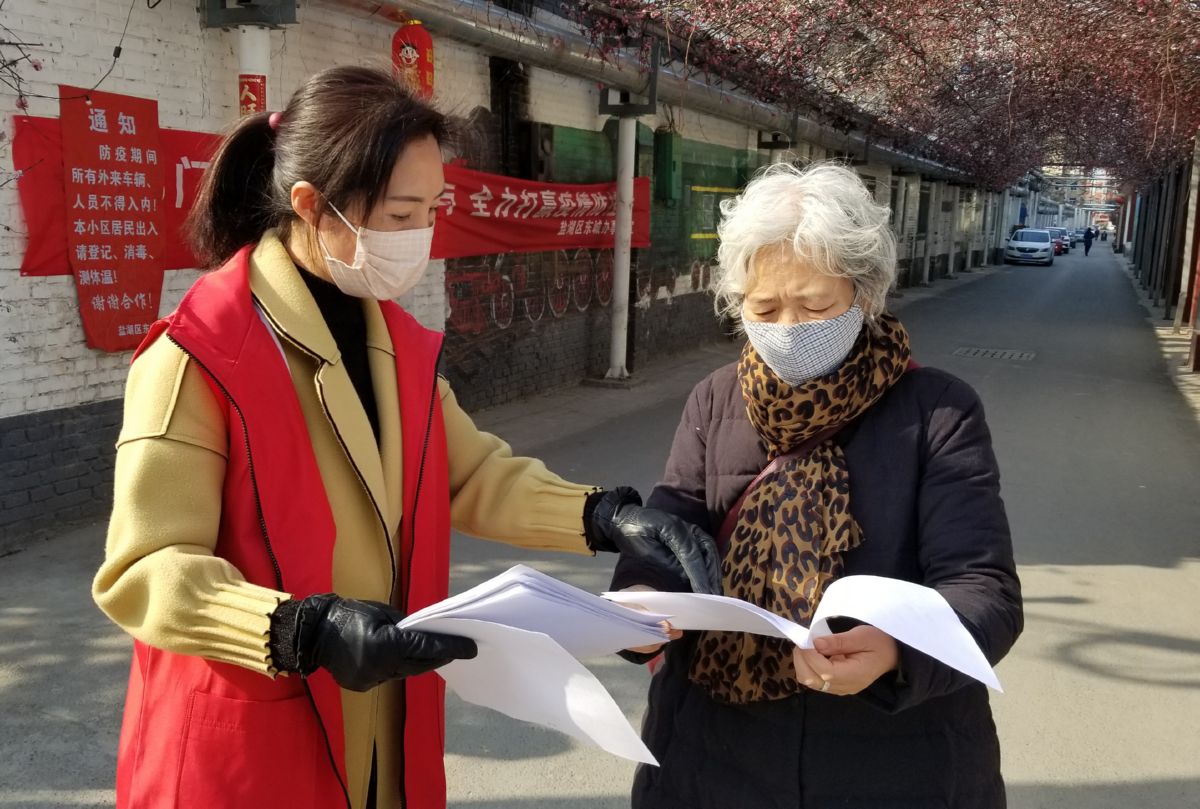 ▲志愿者在为居民发放宣传资料 范楚乔 摄