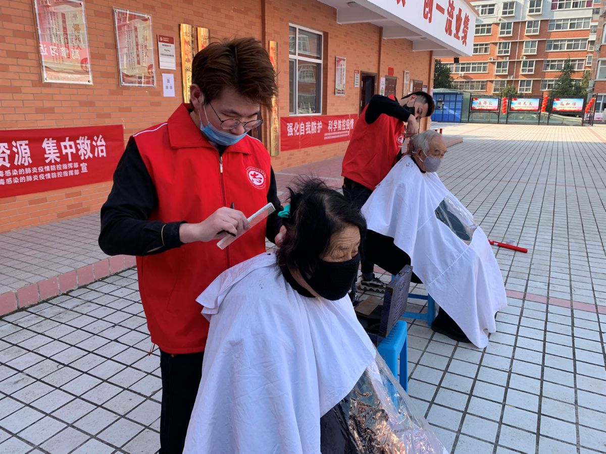 由于疫情期间老人们不便出户,社区工作人员邀请美发行业的志愿者,走进小区广场,为社区的老人免费理发。