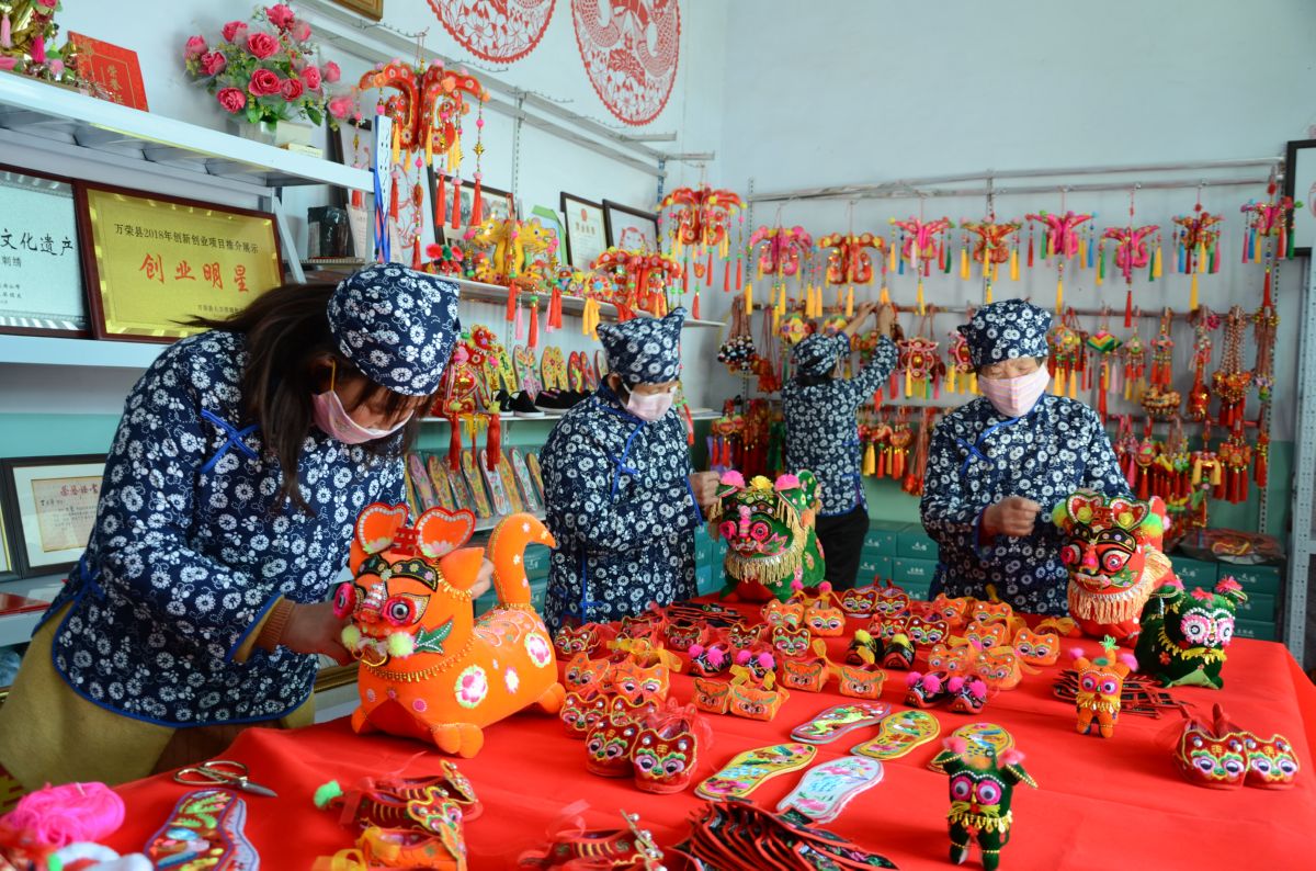 3月4日,在万荣县煜哲手工刺绣厂,几名建档立卡贫困户员工,走上生产岗位,加工刺绣产品。