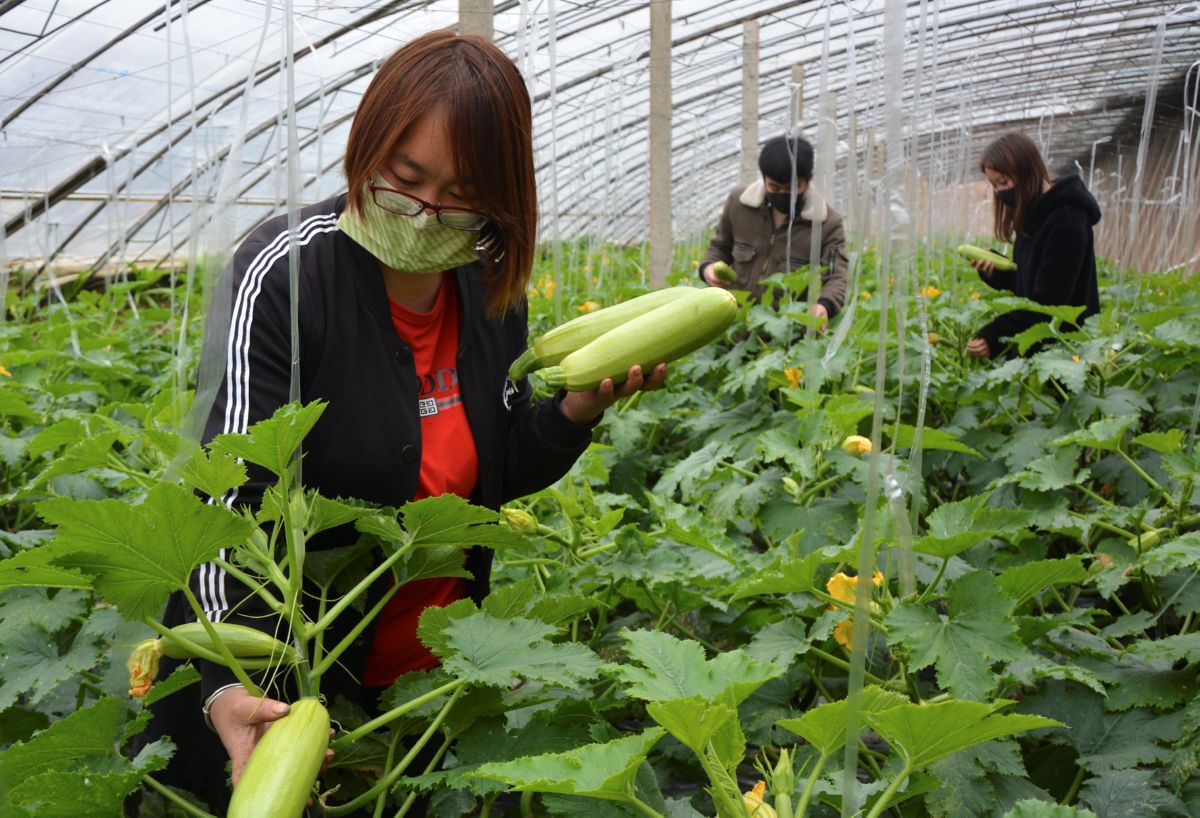 3月5日,盐湖区大渠办北孙坞村村民梁菊萍在大棚内采摘西葫芦。