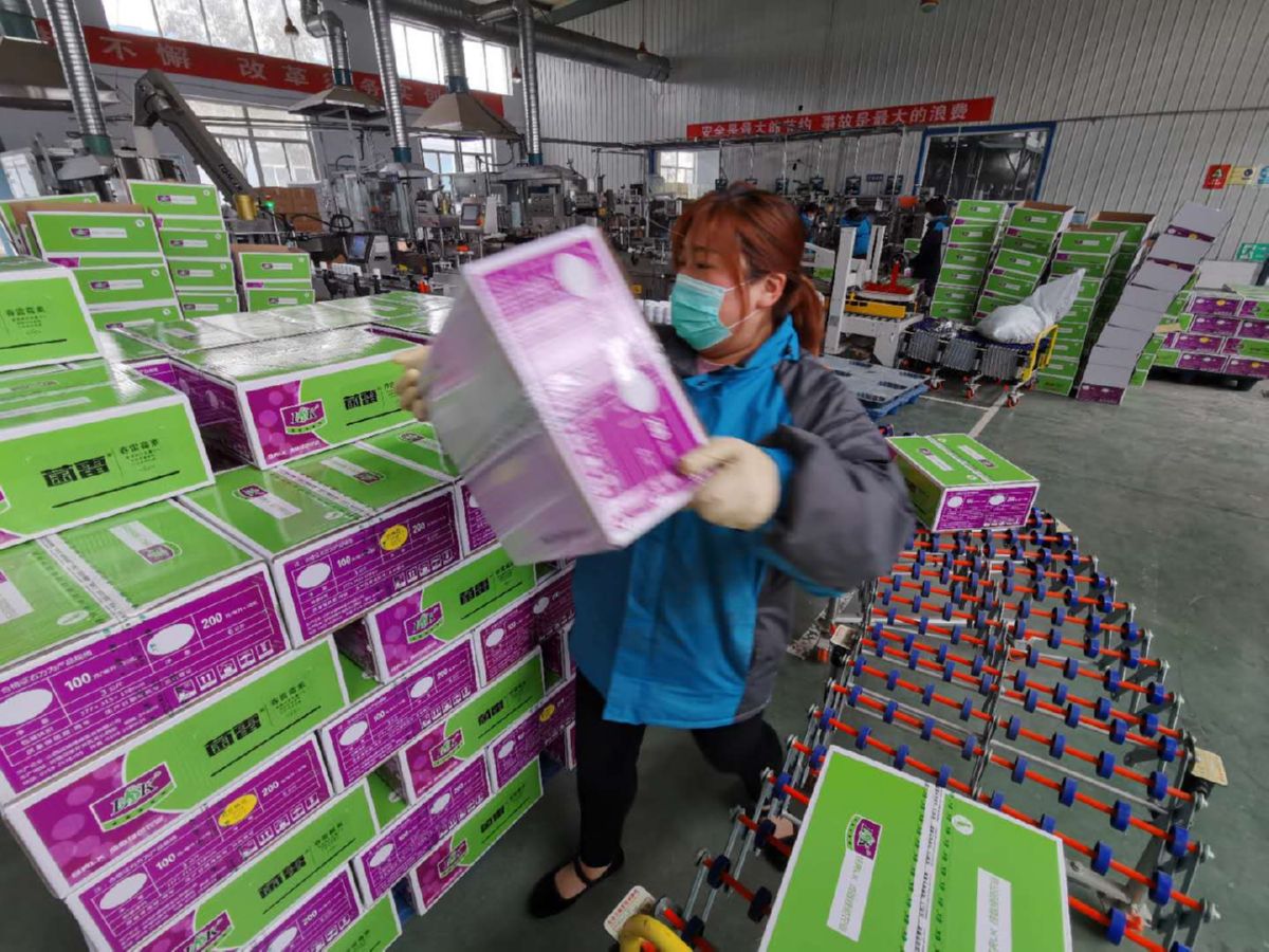 ▲绿康实业生产车间,戴着口罩的工人在搬运流水线上生产好的产品。 景斌 摄