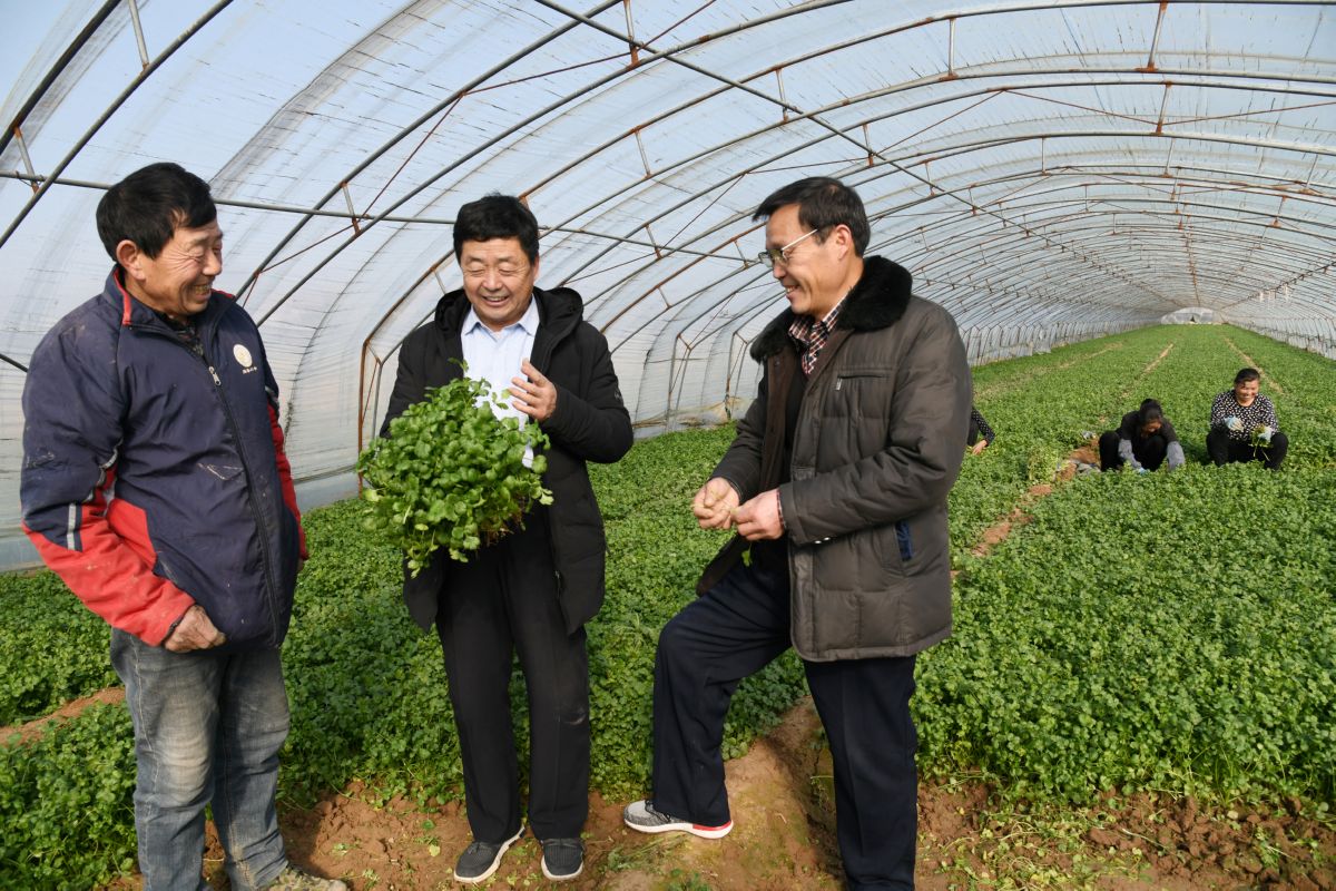 3月6日,闻喜县桐城镇上邱村干部在大棚内向村民了解蔬菜生产情况。