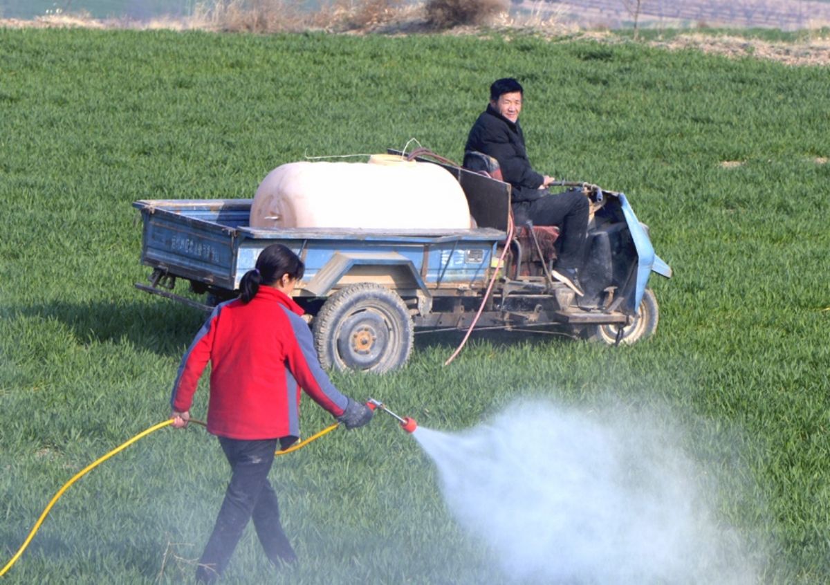 3月6日,盐湖区上王乡董家池村村民对旱地优质小麦进行病虫害防治。 记者 冯革才 摄