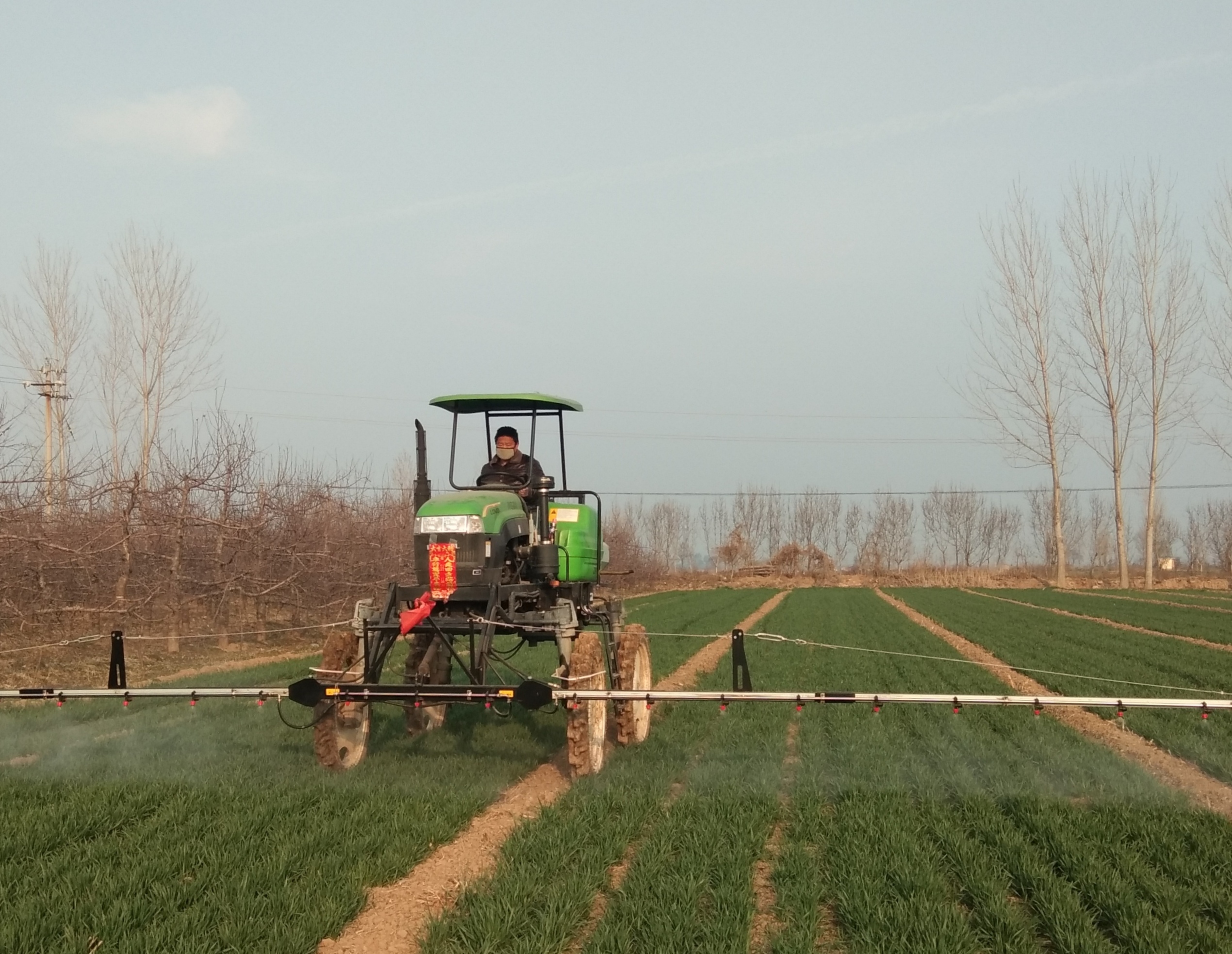 三泉镇一村民在用拖拉机为小麦喷洒农药。