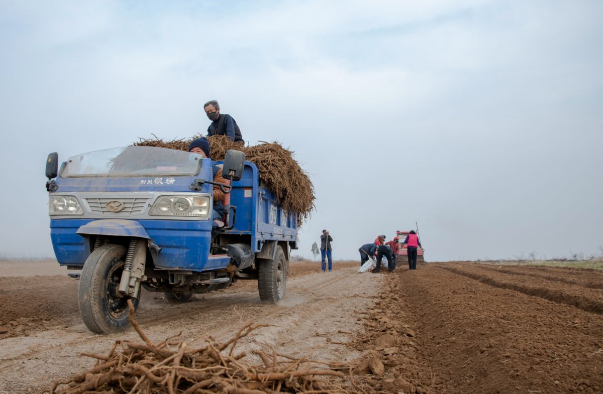 3月9日,新绛县横桥镇曲村村民在收获中药材黄芩。