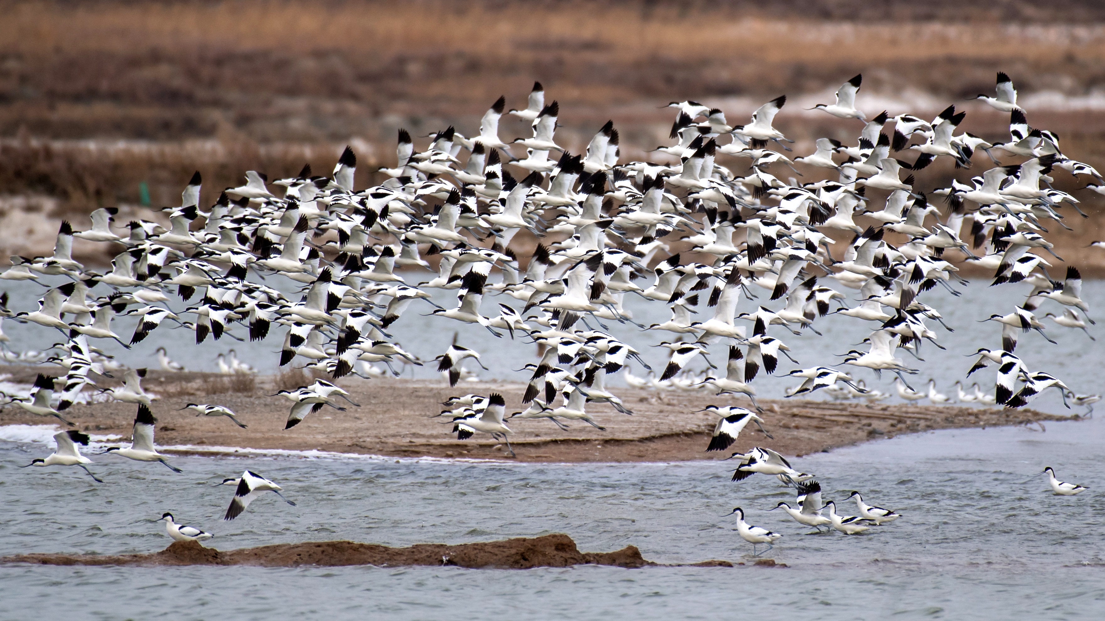 3月9日,一群反嘴鹬在盐湖飞翔。