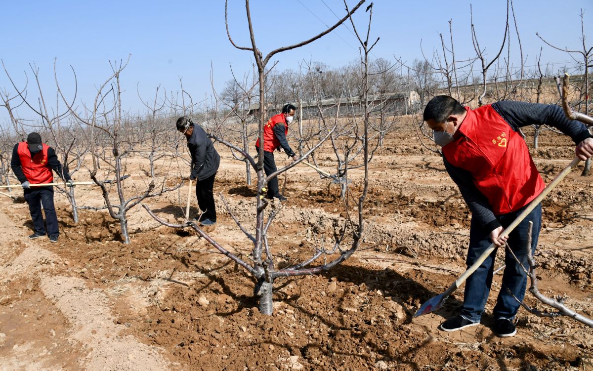 3月12日,闻喜县河底镇茨洼村村民对樱桃树苗进行管护。