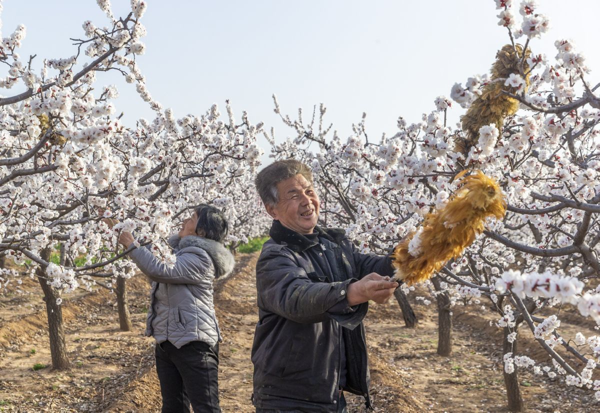 惊蛰过后气温不断升高,夏县庙前镇北上晁村杏花园里的杏花竞相开放。3月10日,村民在对杏花进行人工授粉,确保丰产丰收。 特约摄影 吕向前 摄
