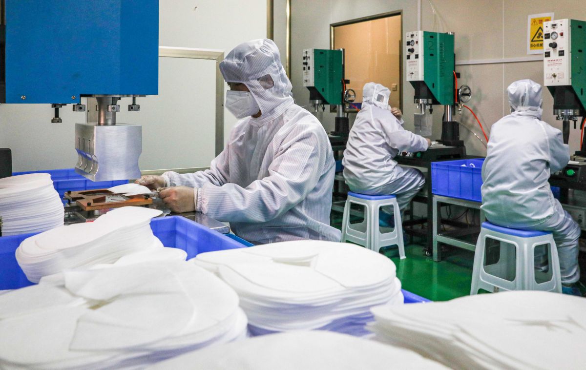 3月12日,山西嘉沃医疗器械有限公司的工人们在生产KN95口罩。