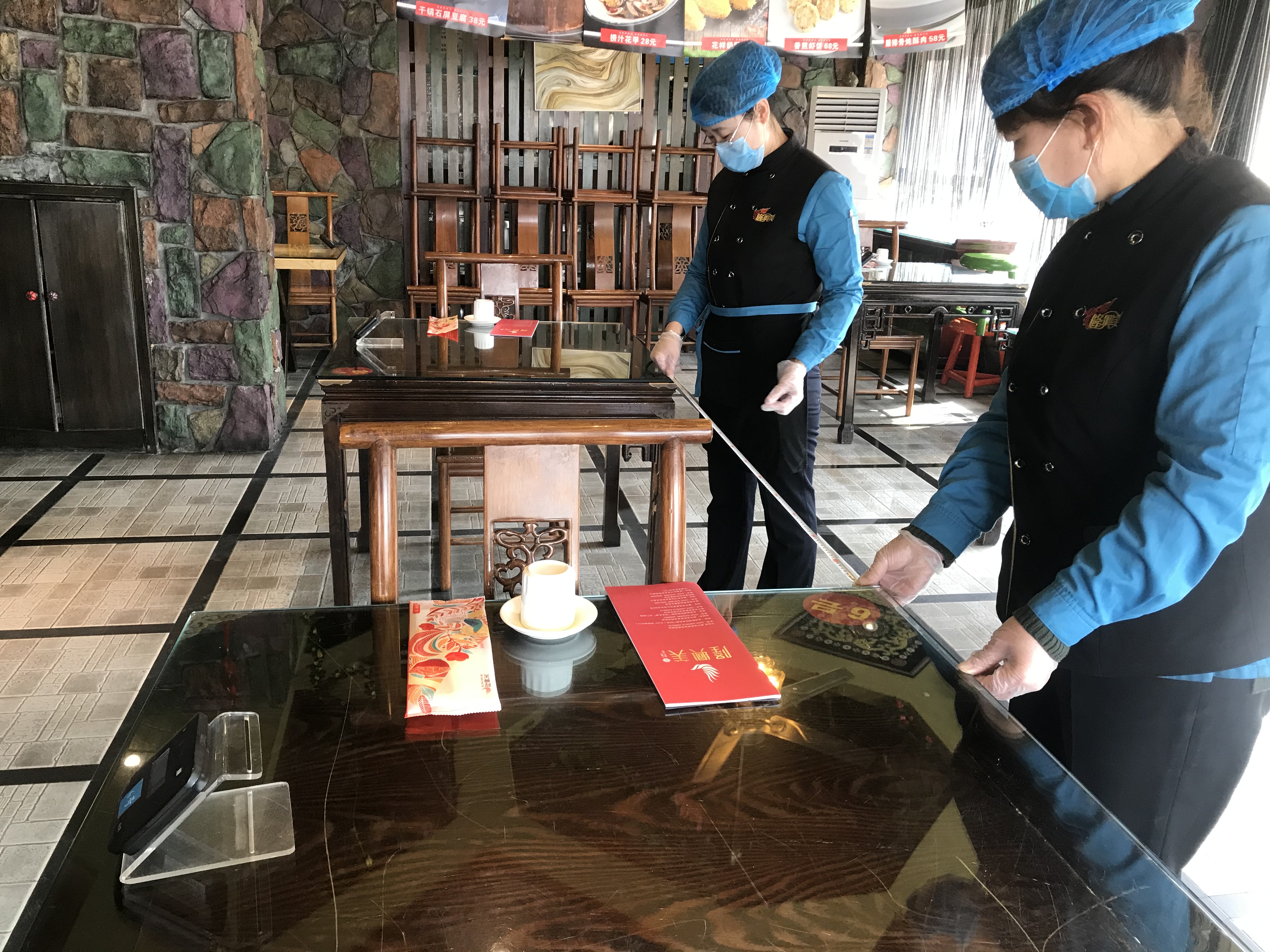 工作人员在测量两餐桌间的距离 王棉 摄