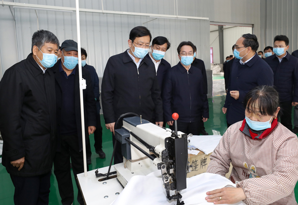平陆县宇泽包装制品有限公司扶贫车间内,机器轰鸣,线轮飞转,贫困户员工已复工返岗,忙碌在生产流水线上。丁小强、朱鹏走进车间,与就业贫困户交谈,询问他们的工作、待遇等情况,详细了解扶贫车间运行、吸纳贫困户就业等情况,对企业积极吸纳贫困群众就业、增加贫困户收入的好做法给予充分肯定。丁小强强调,各级各部门要抓住企业复工复产的有利时机,建立“岗位需求”和“岗位供给”两张清单,组织“门对门”“点对点”劳务输出,促进贫困家庭劳动力成规模、成批次有序外出务工;要及时提供就业指导和技能培训,推进“人人持证、技能社会”建设,不断提高贫困群众的就业能力,把“保就业、保增收”的扶贫目标任务落实好;要大力推动本地扶贫产业发展,促进扶贫企业、扶贫车间进一步扩大规模、提高效能,充分吸纳贫困人口就近就业。