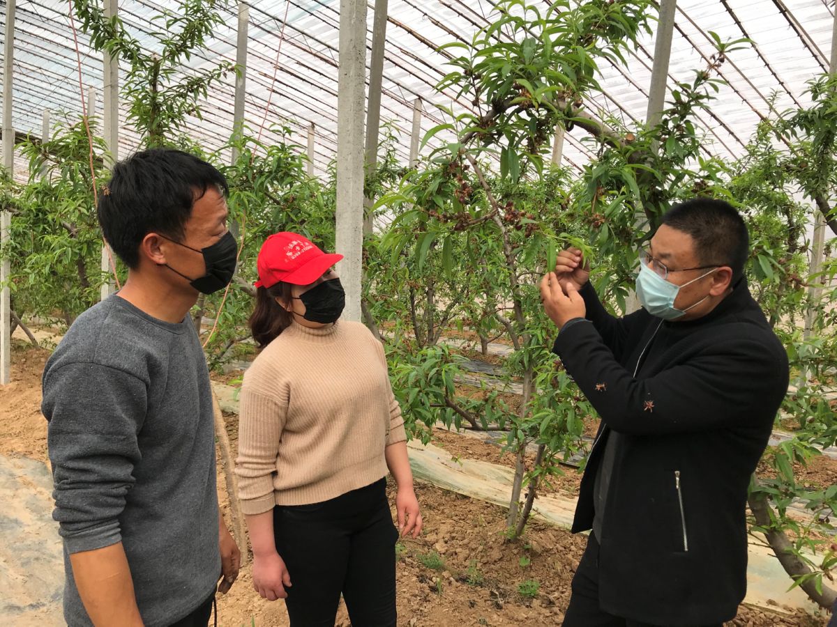 3月13日,在新绛县万安镇杜庄村村民刘阳的大棚油桃田里,农技人员冯玉麟在为刘阳夫妇讲解大棚油桃的病害防治知识。