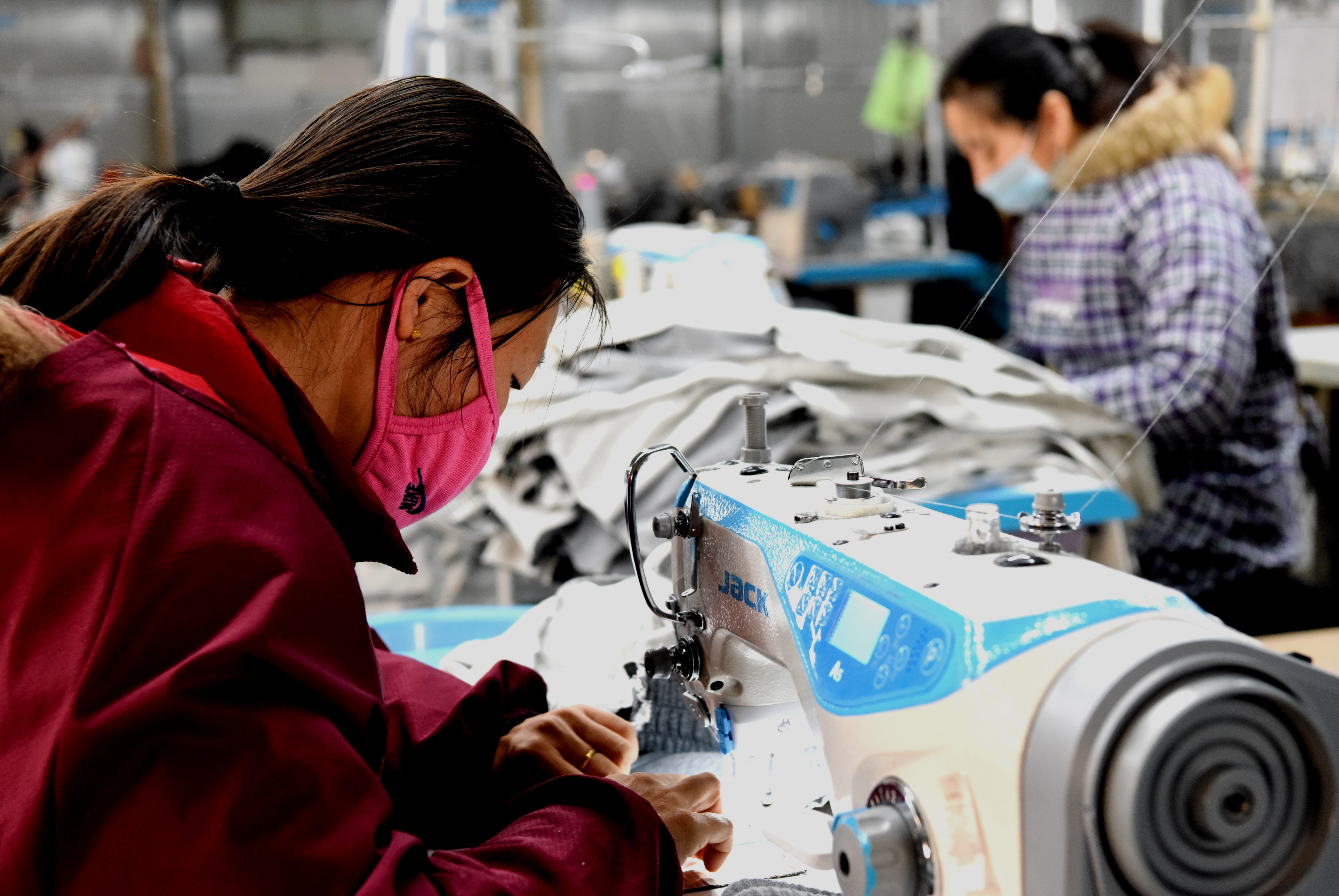 3月13日,垣曲县晋海花园易地扶贫移民安置区“扶贫车间”内,员工在紧张作业。 为取得疫情防控和脱贫攻坚“双胜利”,垣曲县20余家“扶贫车间”近日陆续恢复生产,一批贫困村民在家门口打工,增加了收入。 特约摄影 崔松良 摄