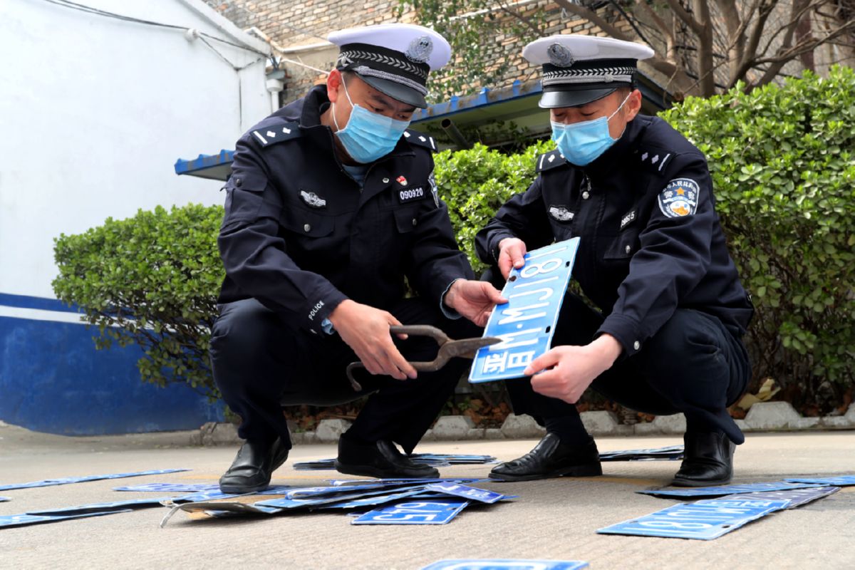3月13日,盐湖交警大队法制科民警对收缴的假牌、套牌进行现场销毁。