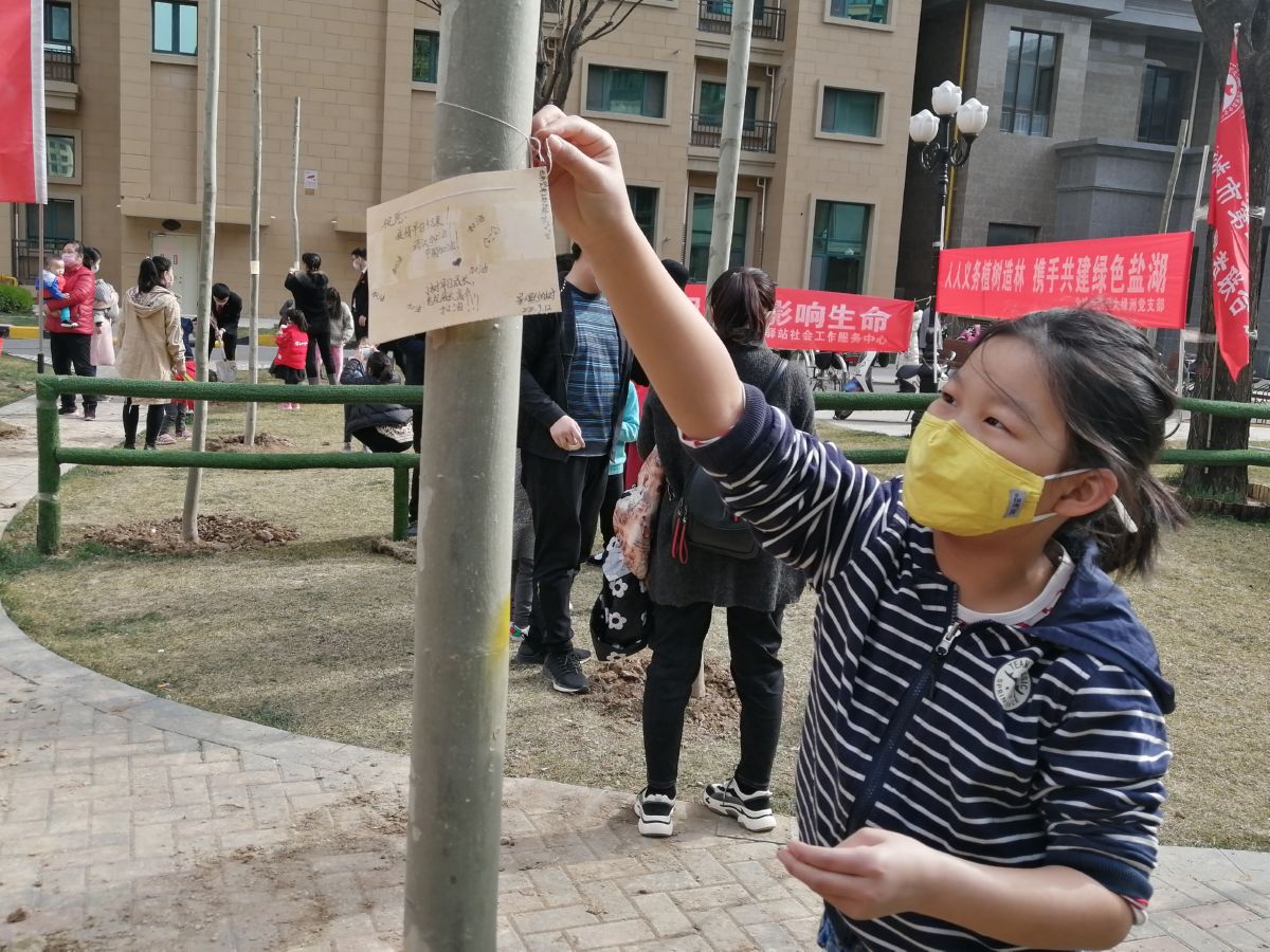 植树现场,居民有序进行翻土、植苗、浇水等程序,并在植树完毕后,贴上了自己制作的爱心卡片。