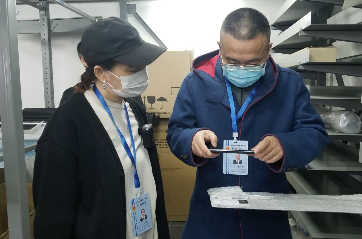 ▲执法人员在现场检查汽车配件 范楚乔 摄