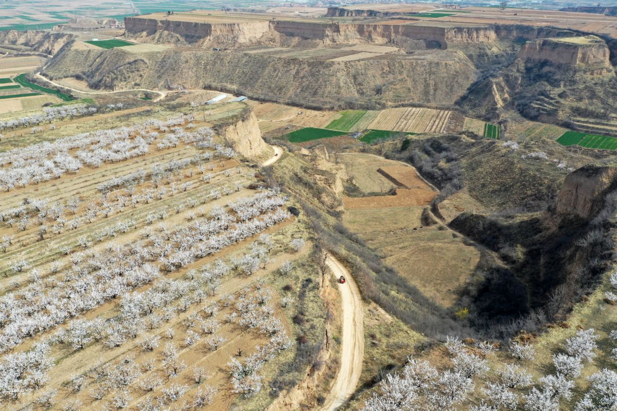 东大有村位于翟店镇西南侧3公里处,属于北方丘陵旱垣地带。大自然的神奇造化,造就了东大有村独特的梯田景观。东大有村的梯田上以杏树为主。近日,记者来到这里,从半山腰到山顶,一眼望去全是花海,竞相开放的杏花层层叠叠,美不胜收。