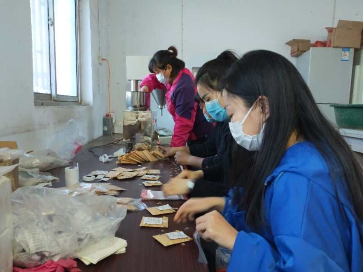 ▲3月16日,平陆县金童果业专业合作社的工人正在分装苹果花粉,准备出口韩国。