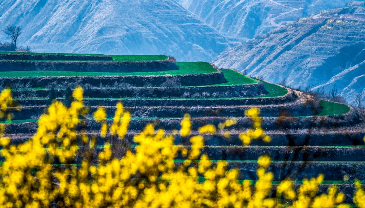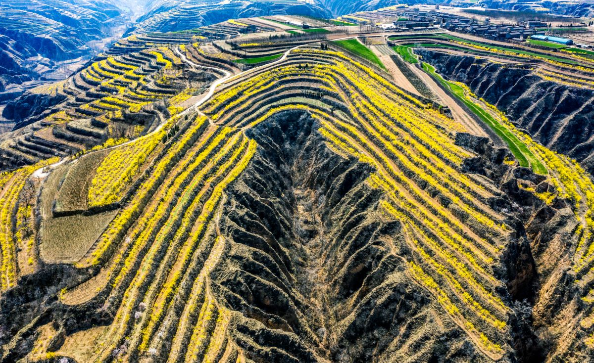 3月17日记者看到,在沸泉村八古洞典型的黄土高坡地貌上,数十块大小不一的连翘田花开正艳。成片的连翘园是由当地村民十多年来陆续建起来的。2000余亩金黄的连翘花点缀在田间、山头,随山势起伏,无边无际。