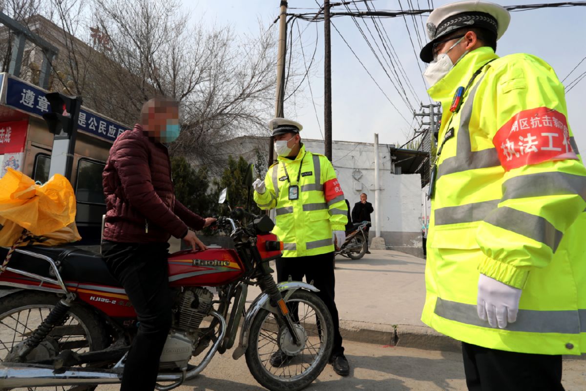 近日,盐湖交警大队一中队民警在市区桃源岗,对一辆摩托车进行检查。 特约摄影 葛崇收