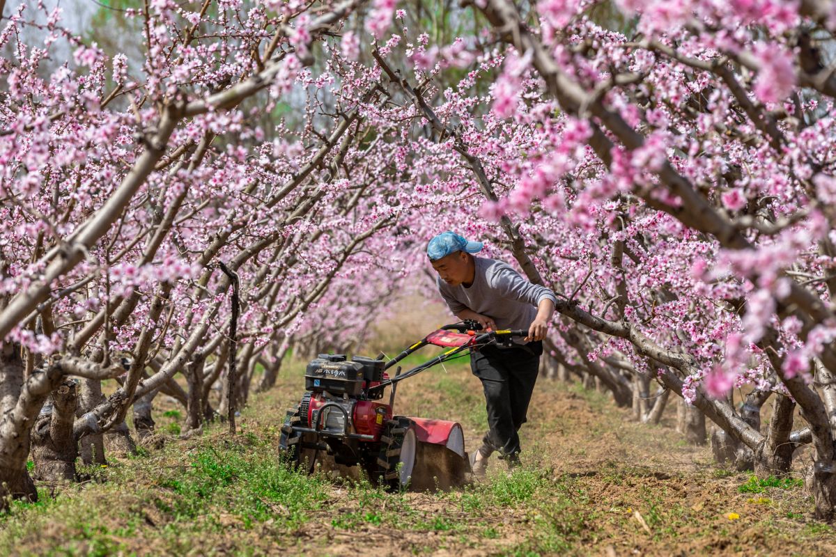 3月19日,在永济市蒲州镇,农民在桃树地里抢抓有利时节,犁地施肥、旋耕除草。 特约摄影 杨建峰