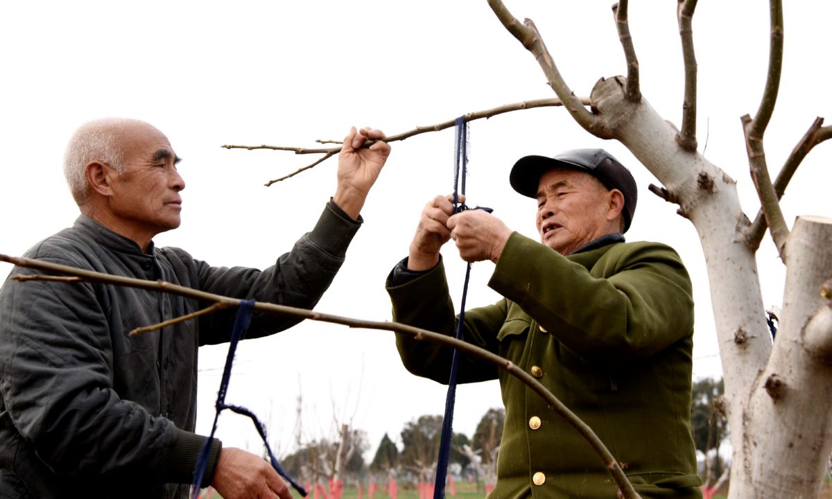 3月21日,垣曲县华峰村一村民在技术员的指导下,为核桃树整形拉枝。