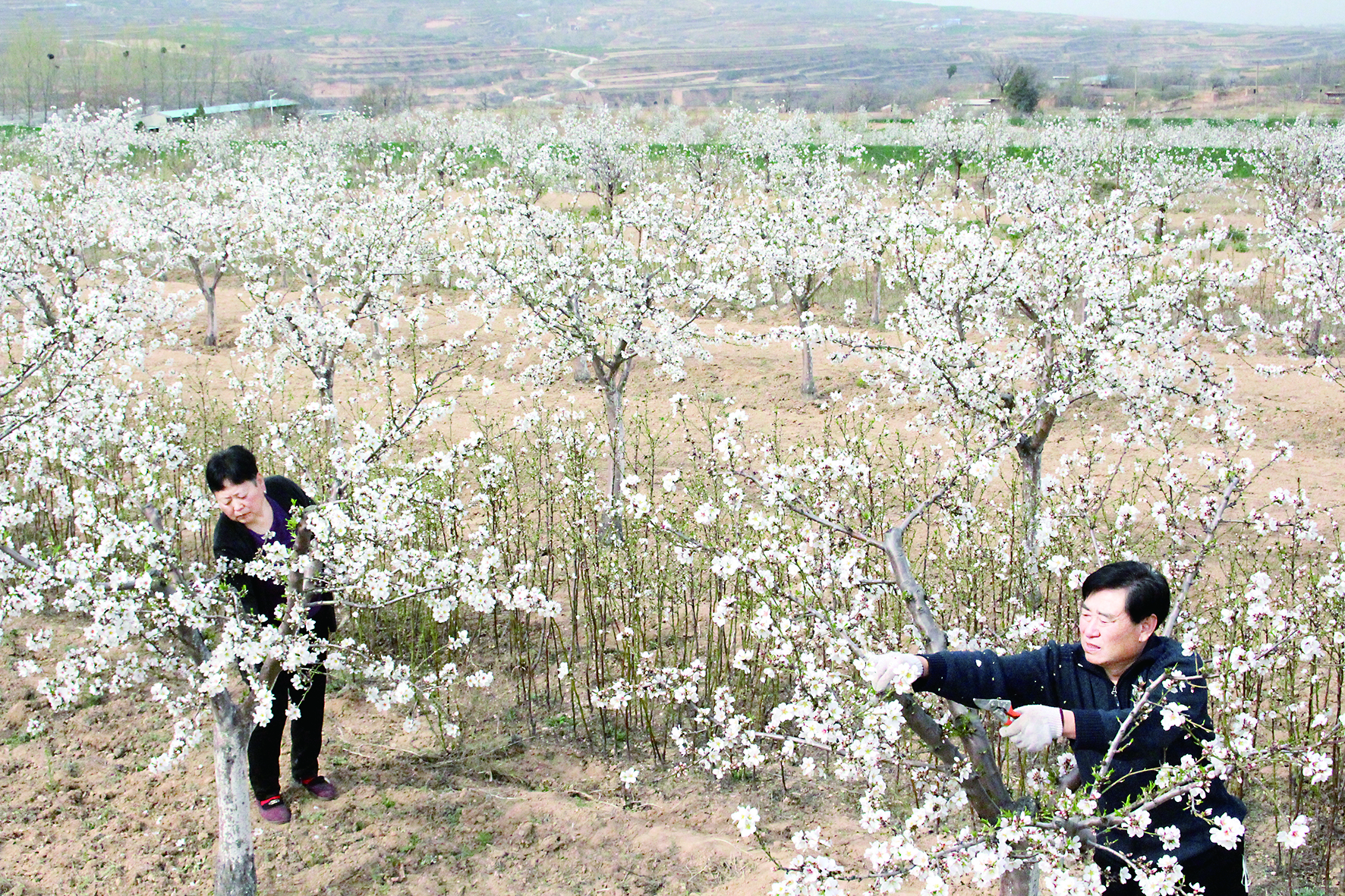3月23日,闻喜县天旺种植专业合作社理事长刘建忠(右),在扁桃生产基地整枝。 2014年,刘建忠从省科院引进“晋薄一号”扁桃新品种项目与技术,先后组织带领村里的52家农民和贫困户参与种植,并签订帮扶协议,种植面积由起初的20亩发展到如今的1000余亩。去年仅扁桃一项,每户贫困家庭增收8000余元。