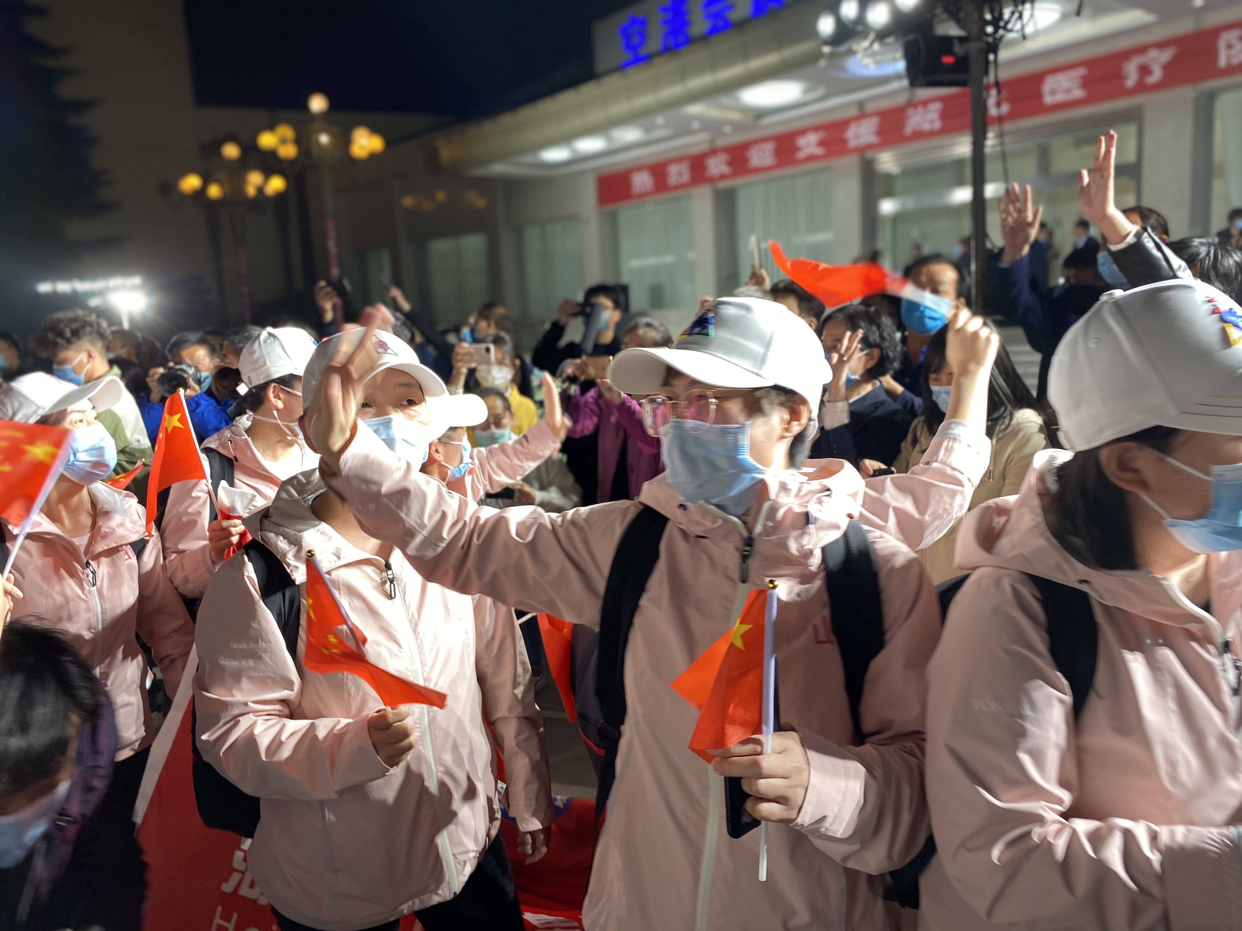 “向战‘疫’英雄致敬”“赤子忠胆报故土 河东亲友迎英雄”“白衣执甲 逆行出征 美丽天使 欢迎回家”“不负使命 英雄凯旋”“致敬新时代最可爱的人”“欢迎回家 你是我们的骄傲”……欢迎仪式现场,迎接人员拉起横幅,欢迎英雄们回家。