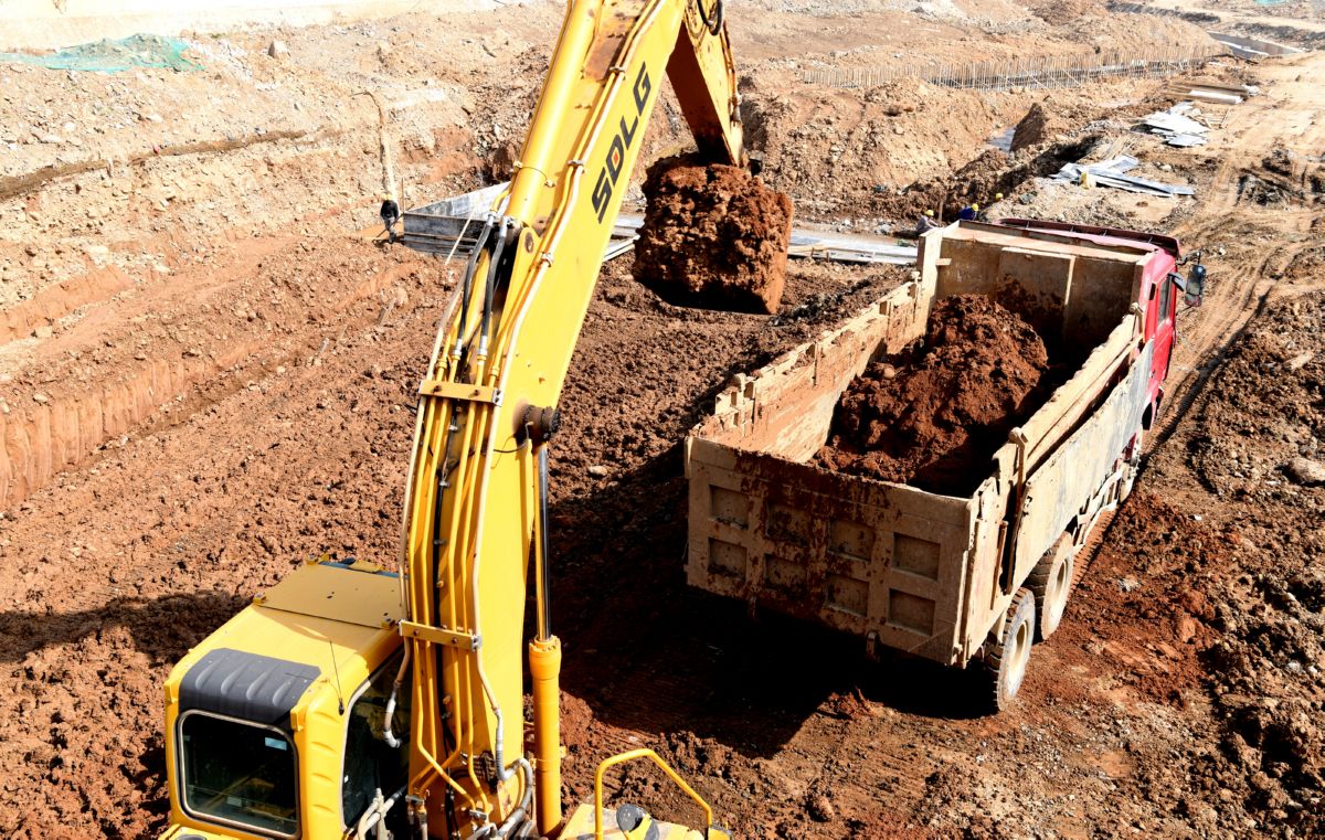 3月23日,在垣曲县亳清河县城段生态环境综合治理北伸工程施工现场,挖掘机在开挖土方。