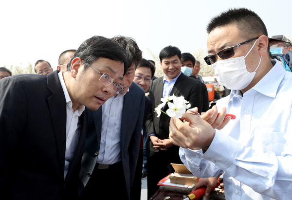 上午11时许,随着丁小强等领导和嘉宾共同启动水晶球,2020“花开河东 乐游运城”美丽乡村百花节正式启动,现场彩球飞舞,掌声阵阵。随后,丁小强一行步入梨园,欣赏梨花美景,参观特色商品展、农机农资展,与农机农资参展人员交流,询问参展和服务农业发展的情况。丁小强指出,要紧紧抓住省委、省政府大力发展山西药茶产业的有利时机,发挥当地资源优势,以产品为龙头,以市场为导向,以文化为内核,引进农产品加工企业,打造槐米茶、梨汤等特色产品,推动运城药茶产业发展;要加快标准化农田建设,大力推广测土配方、精准施肥,积极发展农机合作社,助推农业现代化;要以美丽乡村百花节为契机,加快农旅融合、产业融合、城乡融合,大力发展乡村旅游,促进经济繁荣,带动乡村振兴。