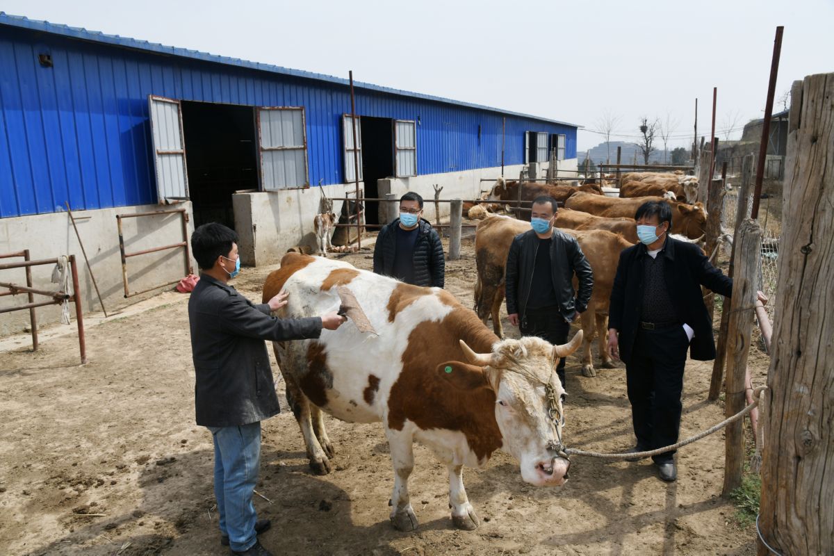 3月23日,闻喜县东镇西干庆村驻村帮扶工作队队员和村干部在村集体养殖场了解养牛情况。