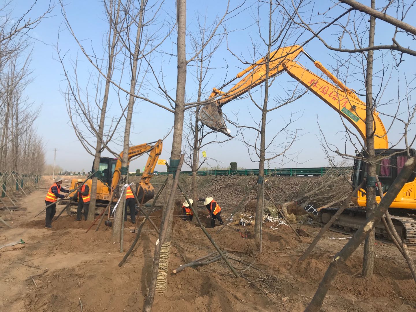 绿化工人在操作吊车和挖掘机,栽植银杏苗木。 王棉 摄