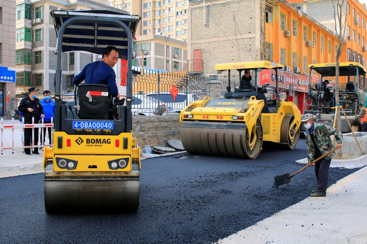 3月25日,中心城区解放路提升改造工程施工现场,工程机械在非机动车道硬化铺油。