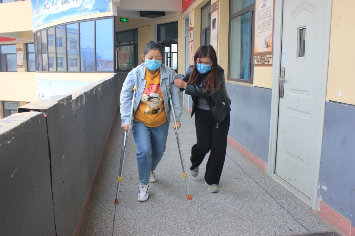 前不久,王一丹脚踝骨折,做了手术后行动不便。为不耽搁其他同学的时间,今年开学复课后,畅丽君主动照顾王一丹的生活,每天早上把她从宿舍搀扶到教学楼三楼,晚上再从教学楼送回宿舍。