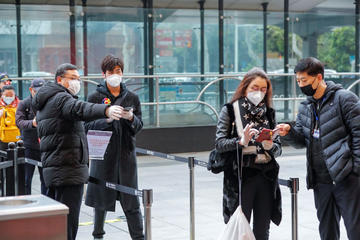 3月30日,在武汉市武商广场外,人们在工作人员指引下,用手机扫描健康码后进入商场购物。