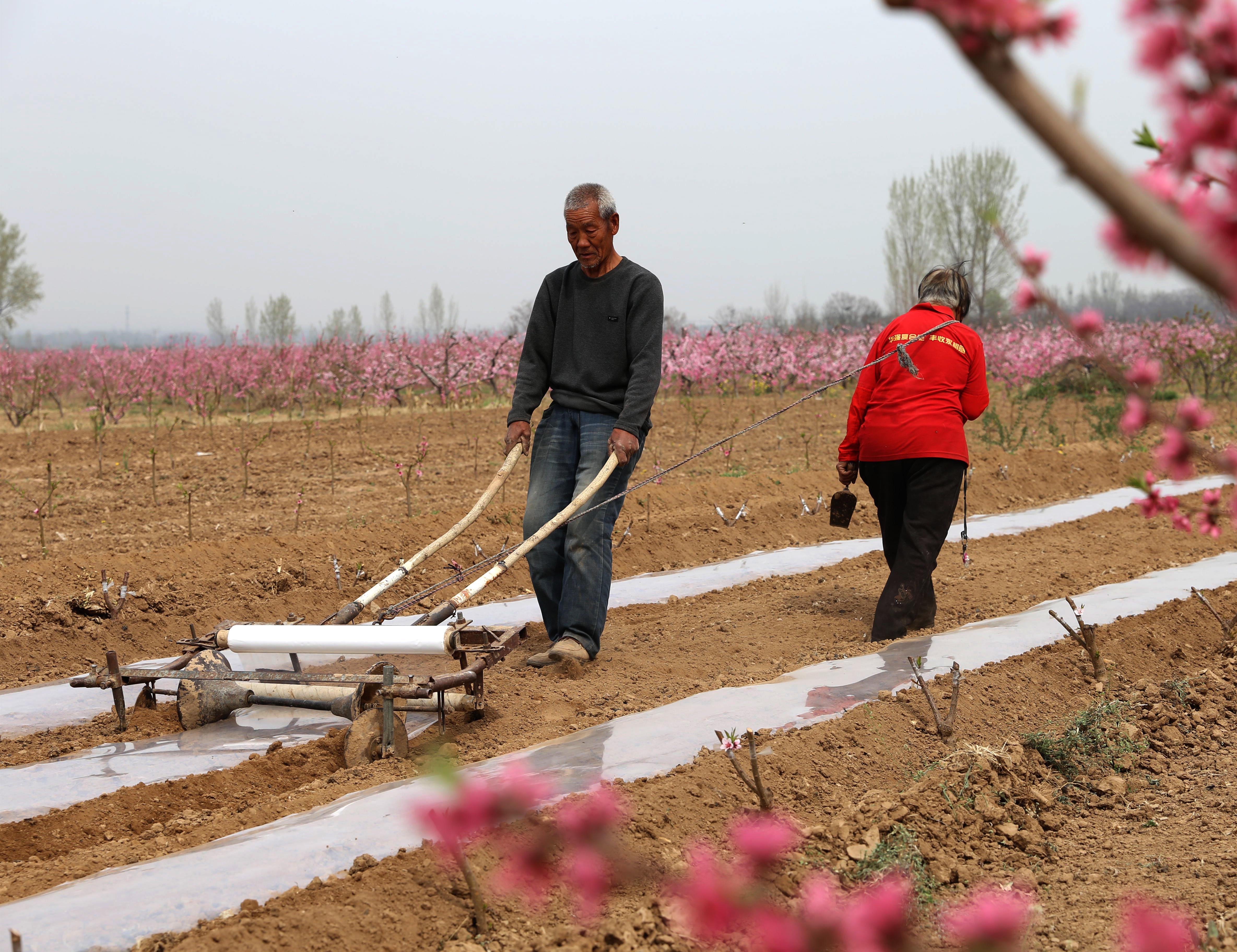 3月29日,夏县庙前镇王峪口村村民田代狮夫妇正在铺地膜种植豆角。 田代狮今年76岁,会木匠、瓦匠、铁匠手艺,他自制的地膜覆盖机省时、省工,除了自己使用,还借给邻居使用。