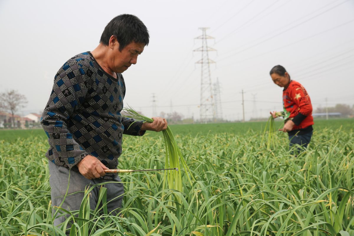 4月1日上午,永济市城东街道办事处马铺头村,蒜农在蒜田里打蒜薹。
