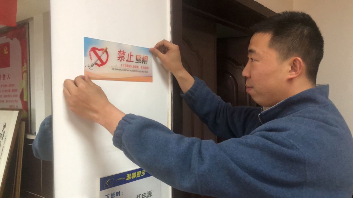 工作人员在办公区域张贴禁烟标识 祁克宁 摄