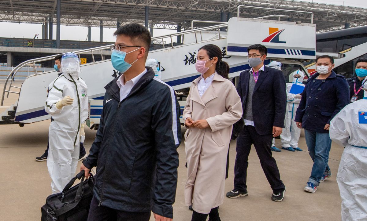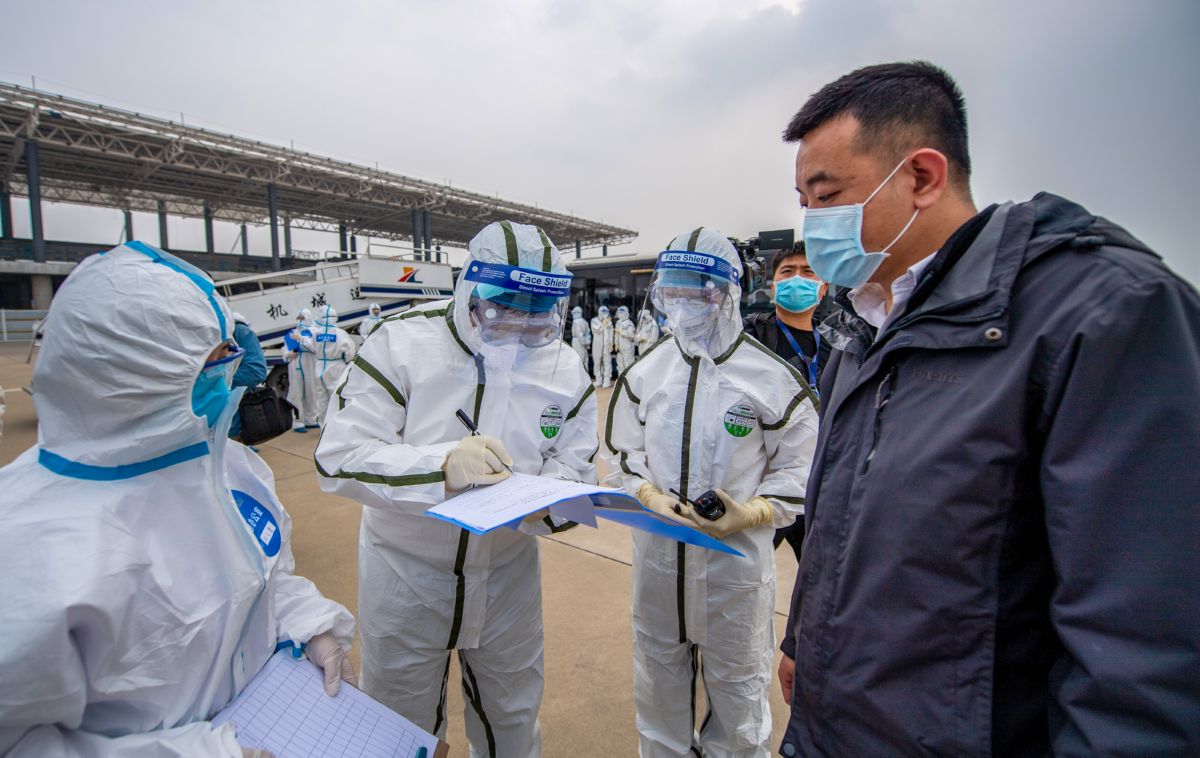▲4月2日,参演人员在“模拟航空器”中对“入境旅客”进行体温测量。