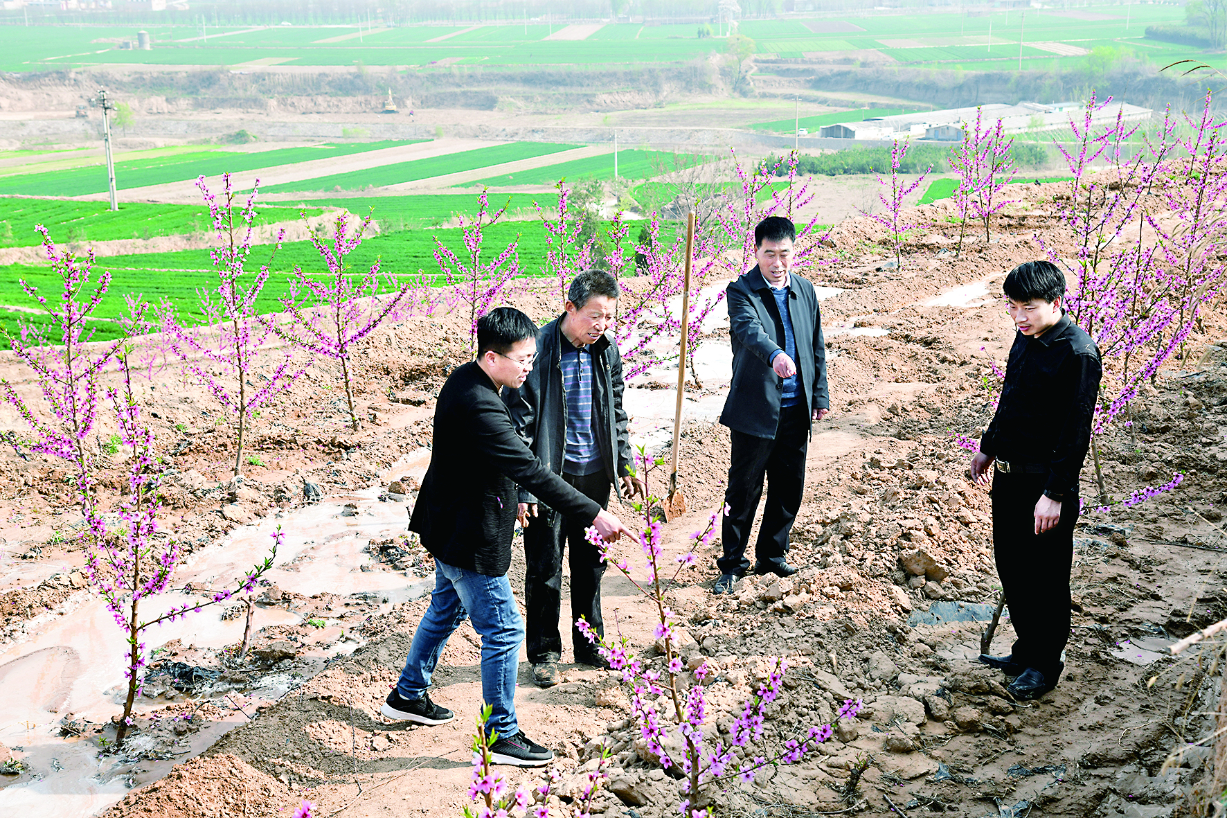 4月6日,闻喜县教科局驻河底镇下庄村工作队队员,在磨盘岭绿化基地了解桃树管理情况。 闻喜县教科局驻河底镇下庄村工作队与村干部经过两年多的努力,共绿化磨盘岭200余亩,栽植各种优质水果苗木2万余棵,在增加集体收入的同时,安排村里贫困户劳动力到磨盘岭绿化基地务工,使他们有了稳定的收入,巩固提升了扶贫攻坚成果。特约摄影 张德福