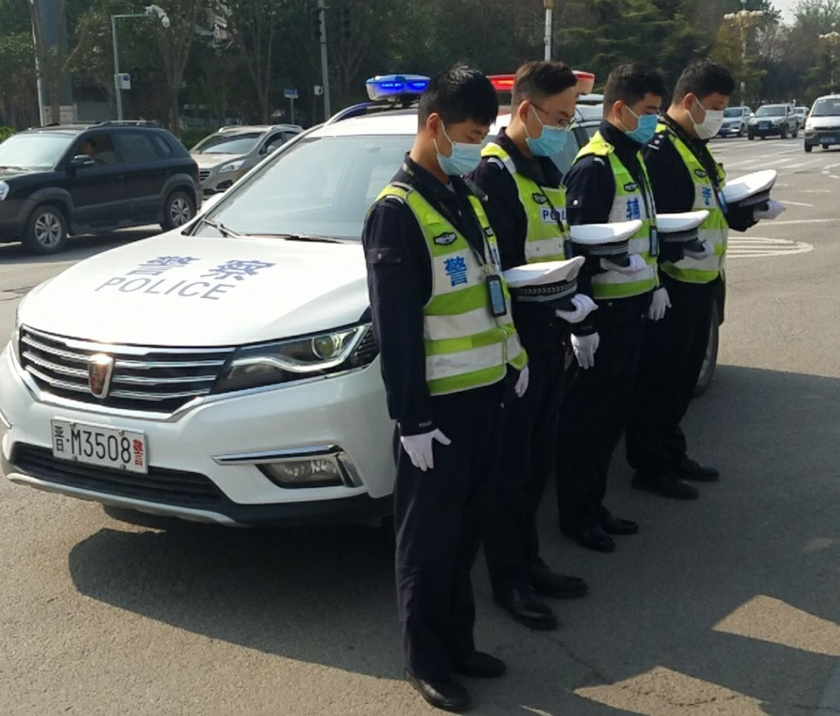 4月4日上午10点,盐湖公安交警大队执勤点民警、辅警脱帽默哀。