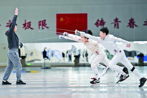 ◀四月七日,天津击剑队男子重剑组主教练张彤(左)在训练中指导队员。新华社记者 李然 摄