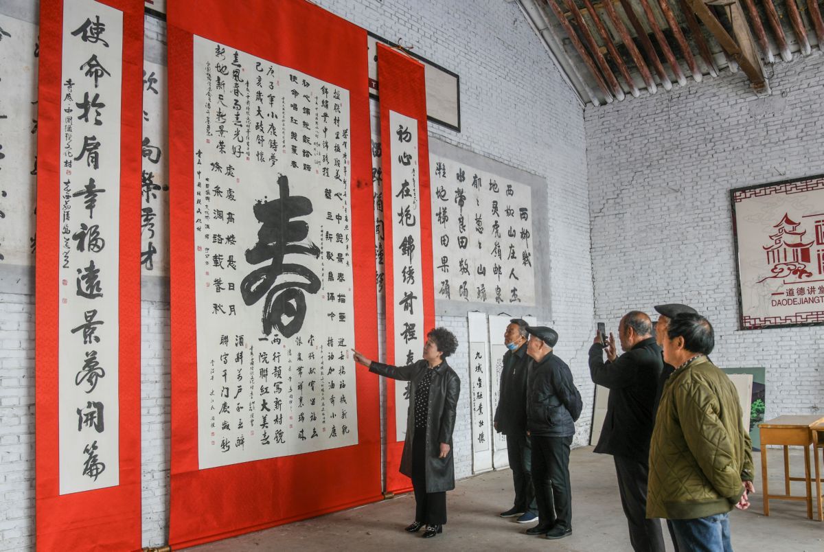 4月6日,闻喜县侯村乡寺底村诗联分会创作的巨幅“众星捧月”式中堂在该村文化舞台展出,吸引众多村民前来参观欣赏拍照留念。