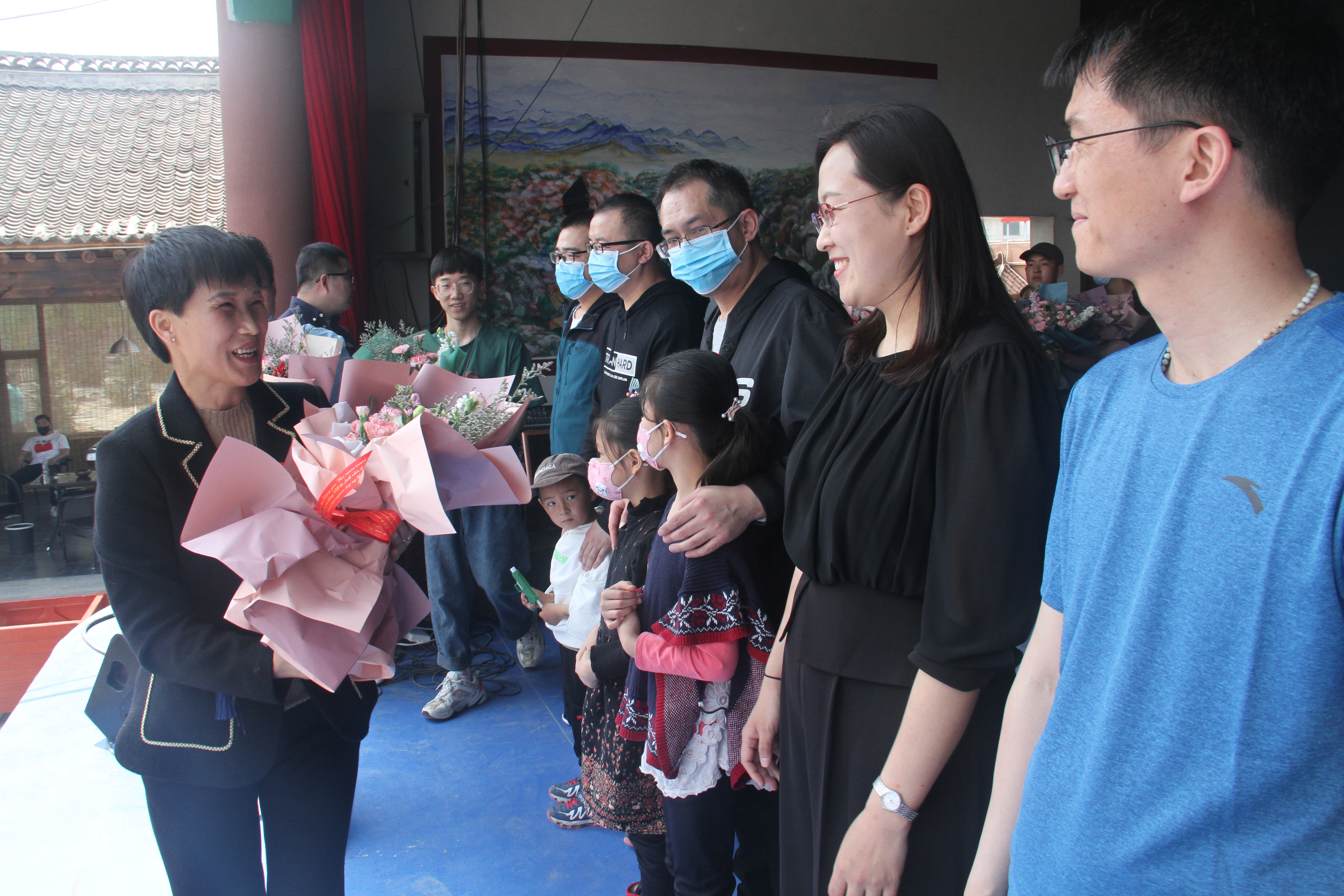 王岚(左一)向战“疫”英雄们赠送鲜花