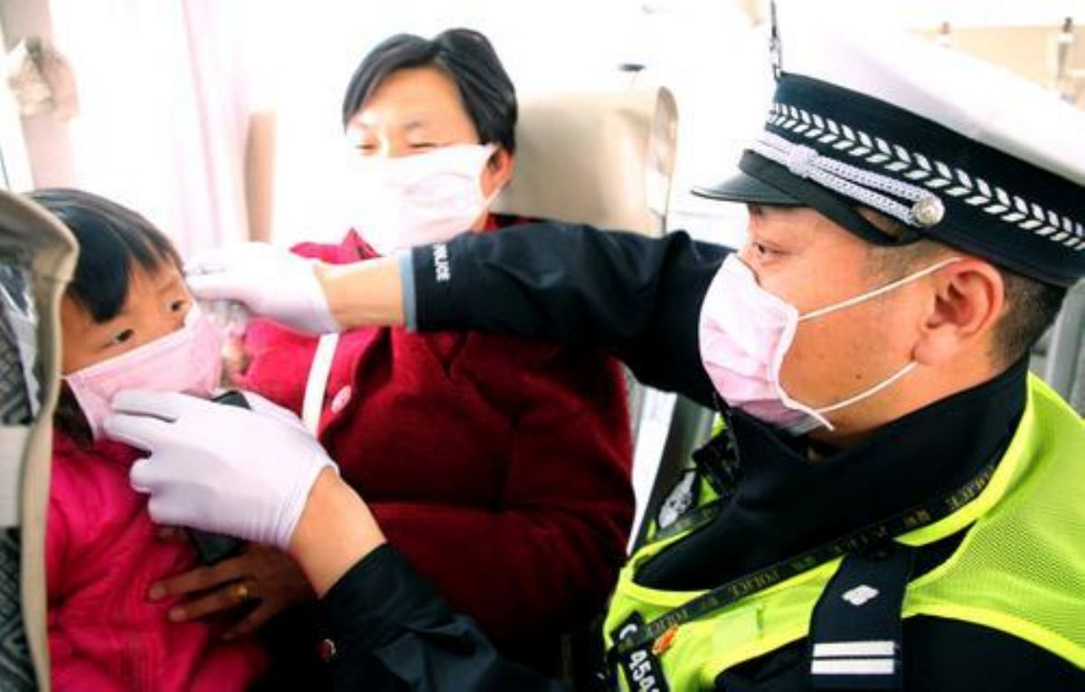 3月27日16时许,永济交警虞乡交警中队民警检查一辆客运班车,发现一位小朋友没戴口罩,中队负责人樊国成将自己备用的一次性医用口罩给小朋友戴上。